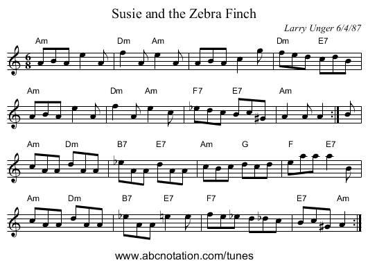 X: 511 T:Susie and the Zebra Finch C:Larry Unger 6/4/87 M:6/8 K:Am "Am" ABA e2A|"Dm" f2A "Am" e2A| ABA c2 g| "Dm" fed "E7"cdB| "Am" ABA e2A|"Dm" f2A "Am" e2c|"F7"_edc "E7"Bc^G| "Am" A2A A2:| B|"Am"cAA "Dm"dAA|"B7" _eAA "E7"dAA| "Am"cBc "G"dcd|"F" eaa "E7" a2B| "Am"cAA "Dm"dAA|"B7" _eAA "E7"=e2e| "F7"fe_e d_dc|"E7"Bc^G "Am"A2:|