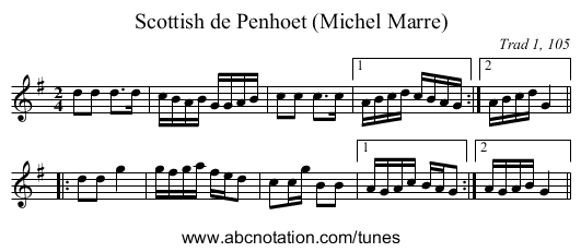 X: 1 T:Scottish de Penhoet (Michel Marre) C:Trad 1, 105 M:2/4 L:1/16 K:G d2d2 d3d|cBAB GGAB|\ c2c2 c3c|1 ABcd cBAG:|2 ABcd G4|| |:d2d2 g4|gfga fed2|\ c2cg B2B2|1 AGAc BAG2:|2 AGAB G4||