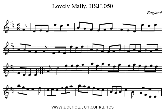 X:9950 T:Lovely Mally. HSJJ.050 M:6/8 L:1/8 S:HSJ Jackson,Wyresdale,Lancs.1823 R:Jig O:England A:Lancashire H:1823 Z:vmp.Chris Partington. K:D F|DED dcd|AGF EFG|FED dcd|AGF E2F|DED dcd|!AGF EFG|FAF GFA|FDDD2:| |:A|d2g gga|bgb afa|!gag fgf|bgee2f|ded fga|bag fed|BABd2B|AFDD2:|]